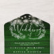All in one wedding invitation featuring pretty string lights, a hand-drawn floral garland and chic typography on a rustic emerald green wood panels background. The invitation includes a perforated RSVP with your wedding website QR code and details. Designed by Thisisnotme©