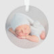 This custom baby's 1st Christmas ornament features a woodland fox, greenery wreath and light wood background. SAMPLE PHOTO OF BABY IS NOT INCLUDED. REPLACE WITH YOUR OWN PHOTO BEFORE ORDERING.