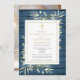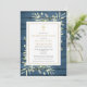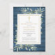 A personalised photo celebration of life remembrance invitation featuring greenery on a rustic blue wood panels background. Designed by Thisisnotme©