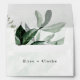 Design features a printed coloured foliage element in shades of blush green and emerald green watercolor eucalyptus foliage leaves wreath on a light green watercolor background. Calligraphy or type writing with the design artwork. Mix and match collection piece. Great for your wedding celebrations!