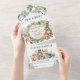 Celebrate the upcoming arrival of your little bundle of joy with this whimsical all-in-one woodland-themed baby shower invitation. The design features a group of adorable forest animals and rustic watercolor greenery
