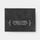Custom wedding response envelopes feature white reply address text with scroll design that you can personalise with a background that has a black chalkboard textured style appearance.