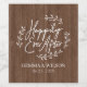 Sweet wedding wine label design features the words happily ever after in a unique script circled by simple laurel leaves with names and wedding dates on a rustic wood background for you to personalise.