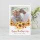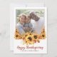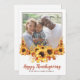 A rustic Happy Thanksgiving card featuring a family photo with sunflowers border and a modern script typography. Personalise with your family name.