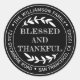 Happy Thanksgiving round return address sticker with your name and address in white stylish typography features the text BLESSED AND THANKFUL in handwritten typography with a stylish touch of rustic foliage on a black background. Also great for a business thank you to customers! Simply add your business name and address or website. Exclusively designed for you by Happy Dolphin Studio.