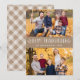Rustic thanksgiving photo card featuring "Happy Thanksgiving" displayed in white handwritten text with a brown kraft paper background. Personalise the front of the cute Thanksgiving card by adding two of your favourite photos, your names, and the year. The card reverses to display a watercolor plaid pattern in shades of brown and beige.