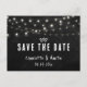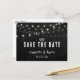 Rustic black chalkboard wedding save the date postcards featuring string lights on a black chalkboard background.