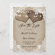 Rustic country wedding save the date card featuring burlap hearts on a beige hessian background adorned with white floral lace and string lights.