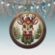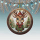 Rustic Holiday Reindeer, Xmas Deer, Christmas tree ceramic ornament featuring a round, brown wooden frame that gives it a rustic and cozy look. Inside the decoration, a cute baby wildlife animal, deer with antlers, in a cartoon graphic style, wearing a green coat, brown hat and scarf, standing in the foreground. In the background, winter wonderland snow scene, completing the holiday season charm of this delightfully unique decoration. Same Image is on the front and back. ensuring that no matter how the decor turns, it always looks festive and complete. 🦌🎄