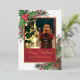 This beautiful Christmas card features a design that combines real foil with hand painted watercolor foliage. The card has your photo on a marbled crimson red background with gold foil lettering and a gold foil frame surrounded by sprigs of pine branches, berries, holly leaves, and pinecones. Beautiful, festive, and elegant, this holiday card has a traditional yet modern feel.