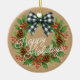 This beautifully designed holiday tree ornament showcases elegant watercolor artwork of a wreath embellished with a white and black buffalo lumberjack chequered bow, pinecones, green holly leaves, red berries, and pine needles. Its classy yet rustic design captures the essence of the December holiday season and appeals to those who appreciate artistic illustrations. The ornament offers customisation options, allowing you to personalise it with your company name, family name, or individual names on the back, and include a tailored seasonal greeting poem, making it a thoughtful choice for spreading holiday cheer.