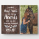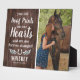 Personalized equestrian memorial plaque featuring a photo of your beloved horse, a rustic wooden background, and a sympathy quote that reads "you left hoof prints on our hearts and we are forever changed", a horseshoe with angel wings, your animals name, and the dates. A wonderful keepsake and tribute of your precious horse or pony.