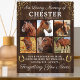 Personalised horse photo plaque featuring 6 precious pictures of your beloved pet animal, a rustic wood background, gold horseshoes & glitter, the text "in loving memory of", your horses name, birth/death dates, and the sympathy quote "your presence we miss, your memory we treasure, loving you always, forgetting you never".