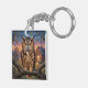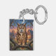 A keychain that features a striking Great Horned Owl, rendered in a rich, thick impasto oil painting style. The vibrant textures and warm sunset backdrop create a cozy, rustic atmosphere that is perfect for nature lovers and art enthusiasts alike.