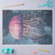 A rustic-style oil painting of a pink and purple jellyfish floating gracefully against a deep blue background, blending marine beauty with rich, moody tones.