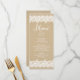 Wedding menu cards feature "Menu" in script, a charming illustrated border design of white floral and dotted lace, and a background with a rustic kraft brown paper textured appearance.