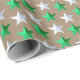A rustic kraft wrapping paper for the Christmas holiday featuring bright green and silver white stars in a repeat pattern on a warm kraft paper.