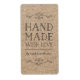 Stylish rustic vertical label with the words "Handmade with Love" between flourishes all in dark grey against a kraft like pattern background. This handmade label is ideal for crafters and makers of handmade goods, like artists, knitters, dressmakers.