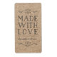 Stylish rustic vertical label with the words "Made with Love" between flourishes all in dark grey against a kraft like pattern background. This label is ideal for crafters and makers of handmade goods, like artists, knitters, dressmakers.