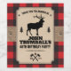 A background of red buffalo plaid contrasts against a kraft paper look panel held on by a burlap strap. The panel holds the party information featuring an elk between two pine trees. Great for a birthday, bachelor party, seasonal event, or a plaid or lumberjack themed celebration. The crossed axe makes a custom logo below. Available with matching products.