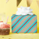 A rustic kraft coloured holiday wrapping paper featuring a bright turquoise blue with centred red wide stripes.