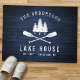 A beautiful, rustic themed doormat, featuring your family name and "Lake House" or other desired text along with its established date and location. This custom, unique design features a white silhouette of crossed boat oars and pine trees on a print of wood planks in rich blue colours. To see more designs like this, feel free to visit my store here at "Zazzle.com/Rustic_Charm". Thanks.