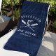 This personalised family lake house beach towel features two crossed oars in the centre accented with a jumping fish, with a rustic navy blue wood background, with family name, lake house location and established date in easy to use text templates.