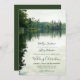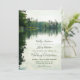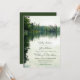 This rustic lakeside evergreens wedding invitation card, created from my own personal kayaking photograph and with a subtle digital watercolor effect, features a beautiful rustic scene under an overcast sky with lightly rippled but calm water reflecting distant evergreens, cedar trees and rock structures, perfect for a mountain, lakeside, or riverside wedding celebration - by katz_d_zynes
