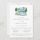 Rustic watercolor mountainside lake scene, rehearsal dinner invitation. Chic and simple typography design with oxford blue colour backing.