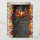 Birthday celebration design featuring a beautiful autumn lantern with lit candle as a centerpiece to a table arrangement of beautiful fall leaves in vibrant autumn splendour. The background features a chalkboard distressed design flanked on either side with gorgeous fall leaves, and backed by a rustic washed wood planks look background. Composite design by Holiday Hearts Designs.