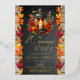 Birthday celebration design featuring a beautiful autumn lantern with lit candle as a centerpiece to a table arrangement of beautiful fall leaves in vibrant autumn splendour. The background features a chalkboard distressed design flanked on either side with gorgeous fall leaves, and backed by a rustic washed wood planks look background. Composite design by Holiday Hearts Designs.