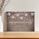 Our rustic elegant engagement party invitations feature a dark kraft background with strings of white lights and luminous paper lanterns across the top, and "engagement party" in chic calligraphy script typography. Personalise with your engagement celebration details beneath in white lettering.