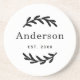 This simply elegant custom monogrammed beverage coaster features leafy laurel branches that frame a family last name. A beautiful keepsake gift for newlyweds or new homeowners. Black design colours can be modified to coordinate with your home decor.