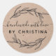 Rustic round sticker featuring laurel leaf, script calligraphy "handmade with love" with modern typography.