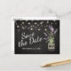 Country chic save the date postcard template featuring a rustic black chalkboard background, string lights, a mason jar with purple lavender flowers, wrapped in burlap with the couples initials and a save our date template that is easy to personalise.