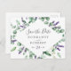 This rustic lavender save the date postcard is perfect for a simple and elegant outdoor wedding. The floral design features watercolor eucalyptus leaves and greenery with sprigs of purple wildflowers.