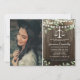 Rustic country law graduation party invitations featuring a wooden background, a photo of the graduate, elegant watercolor greenery, string lights, scales of justice, and a modern text template that is easy to personalise.