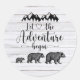 Rustic walking bear family let the adventure begin baby shower stickers, on a wood background. Calligraphy with heart.