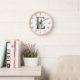 Wood framed wall clock features rustic wood letter E monogram with watercolor eucalyptus and lavender embellishment. Perfect for bedroom or Livingroom walls.