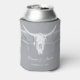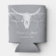 Rustic light grey white bull cow skull country western cowboy wedding reception beer can cooler for guests. Vintage farmhouse inspired printed distressed texture. Old wild west antique style. Cool, trendy, modern farm animal design. Personalise your script. Image copyright Marg Seregelyi Photography.