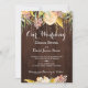 Floral bouquets of ivory, gold, peach and blush peony roses with fern green foliage wedding invitation template on a dark brown barnwood like background with strings or twinkle lights and a fancy modern contemporary changeable script text. -------- The invitation is ideal for rustic autumn fall, winter or spring floral elegant weddings.