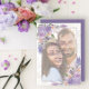 Modern and trendy, this pretty rustic style wedding Save the Date card design features a rustic lilac lavender floral watercolor design, featuring a super pretty design of lilac, lavender, and dusty blush pink flowers, hand lettered script typography and faux gold dust, on a faux vellum overlay which all prints over your favourite engagement photo. Part of a matching wedding suite. Contact designer for matching products. Copyright Elegant Invites, all rights reserved.