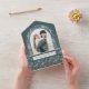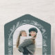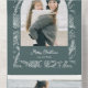 This unique design features a trendy arch-shaped photo template with a white line drawn winter botanical border on a sage green background. The panels feature complementary floral graphics, text fields and a bonus tearaway photo template.