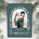 This unique design features a trendy arch-shaped photo template with a white line drawn winter botanical border on a sage green background. The back features a complementary seamless pine and holly pattern.
