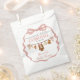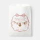 Send your guests home with a touch of country charm using this Little Cowgirl baby shower favor bag! Featuring a blush pink ribbon border and a rustic clothesline with cowgirl boots, hats, and baby essentials, this sweet design celebrates the arrival of “a sweet little cowgirl.”