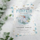 ‘Sweet little pumpkin’ boy baby shower invitations featuring a simple white background, a cute blue watercolor pumpkin, butterflies, florals, eucalyptus, gold and blue stars, and a modern baby shower template that is easy to customise.