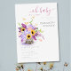 A rich bouquet made of lush hydrangeas, sunflowers, lavender, wheat, baby's breath, ivy and ranunculus flowers makes for a lovely illustration, hand-painted in digital watercolor, that decorates this rustic elegant, girl baby shower invitation. Romantic and charming, it is a lovely choice for any rustic setting.