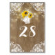 Rustic country barn wedding table number cards with baby's breath, sunflowers, wood, lace and mason jar lights