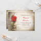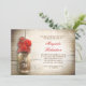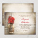 Romantic rustic wood background and mason jar with red flowers bridal shower invitations. I suggest a beautiful linen texture paper for this design.