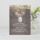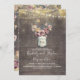 Vintage rustic wedding anniversary invitation features mauve and gold floral mason jar, string of lights, and old barn wood background.